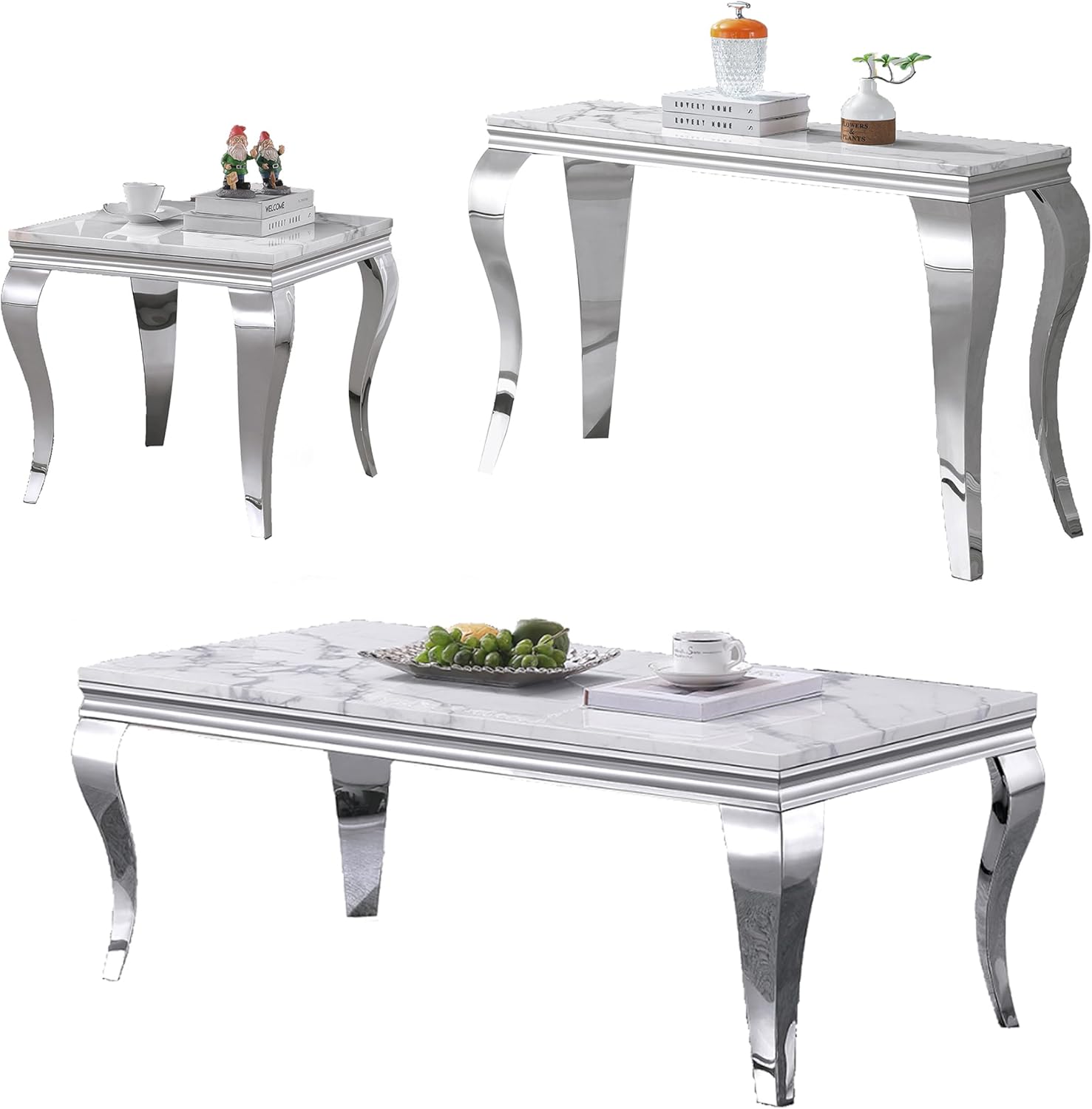Bring a beautiful touch of modern to your home with the unique Coffee Table Set. With high glossy faux marble top and unique mirrored stainless steel frame, this living room table set is designed to stand out in your home. Stainless steel and marble top are easy to clean and durable for beauty that will last.Features:1. Elegant Style: Unique geometric stainless steel base with gold/silver mirrored finish is the combination of classical and modern. Match with marble top to bring your home a whole new art style.2. High Quality Material: The tabletop is made of high quality faux marble, resistant to water & scratch-proof, not easy to break.Unique geometric shape gold/silver mirror finish stainless steel base stand out in their sturdiness & appearance.3. Aesthetic and Practical: Versatile and functional, its rectangular marble top offers the vintage and elegance feel that you are looking for in your dream home.The combination of marble and stainless steel makes this coffee table a perfect element to bring you the art of visure. The desktop has enough space to place that you need.4. Difference Options: You can find this coffee table in different color, thus being able to choose the one that best suits your home.5. Simple Assembly: With simple steps, an adult can complete the installation process in about 10-15 minutes. The clear illustrations in the instruction manual will assist users install this product smoothly.Specification1.Main Color: White+Gold / White+Silver/Black+Gold2.Table Top Shape: Rectangular coffee table console table / Square side table3.Top Material: Faux Marble(MDF)4.Base Material: Stainless Steel5.Coffee Table : 46.85"L x 22.83"W x 17.72"H6.Cosole Table: 46.85"L x 14.96"W x 31.5"H7.End Table: 22.83" L x 22.83"W x 21.65"H