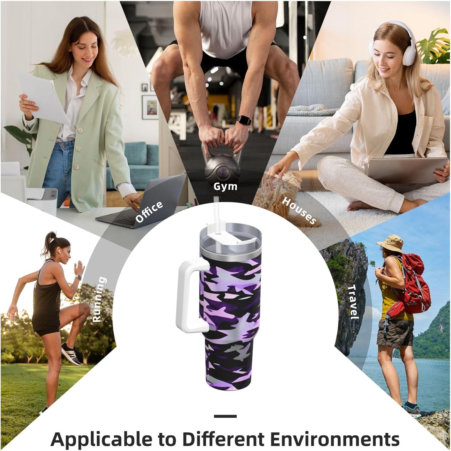 This American Camouflage Purple Print Ice Bully Cup features a double layer stainless steel design that can be used for a long time without rusting. The lid has good sealing to prevent water from overflowing, and it is easy to unscrew for filling and cleaning. It can keep water, coffee, or drinks warm or cool for hours and is suitable for travel, camping, and driving.