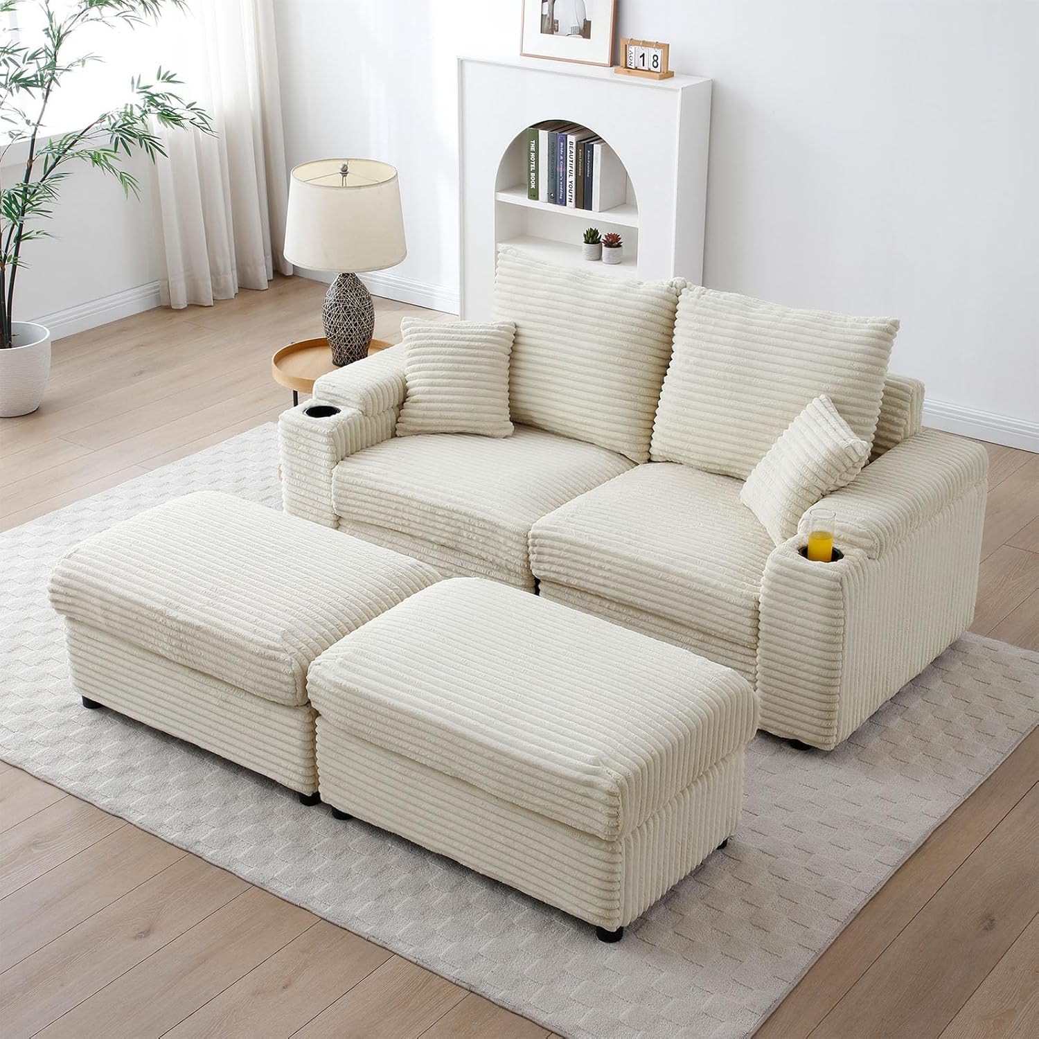 Single Chair: Overall Size: 54.4”D*43.3”W*30.4”HSeat Size: 26"W*27"D Footstool Size: 43.3"W*21"D*18"HCushion thickness: 8"Loveseat Sofa: Overall Size: 56.2”D*70.8”W*30.4”HSeat Size: 54.3"W*27"DEach Footstool Size: 34"W*22.8"D*18"HCushion thickness: 5.5"Specification:Material: CorduroyWeight capacity: 250 lbs/seatSeat Structure: Foam + Spring PackFrame Material: Pine + Eucalyptus + Plywood. Sofa feet: Plastic feetAssembly Required: Yes(see instructions)