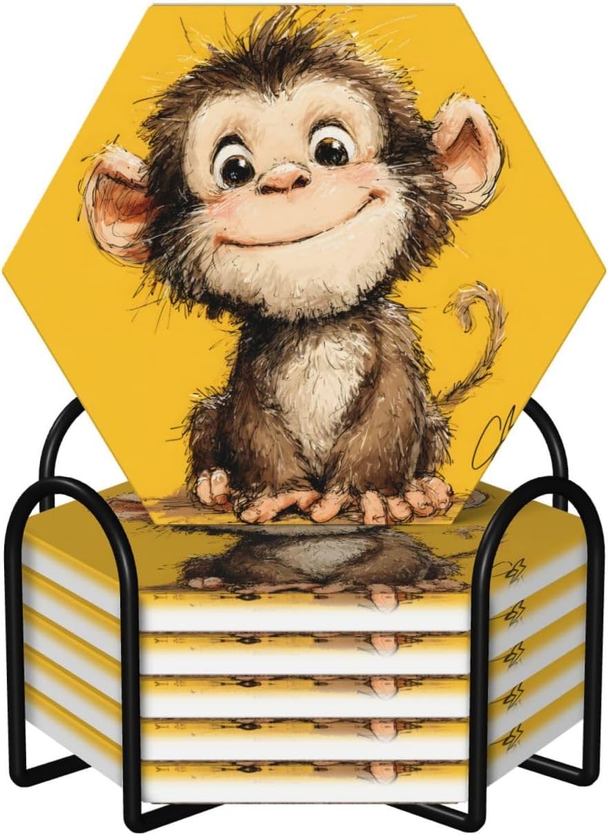 Product Name: DCEHGEW Ceramic Drink CoastersMaterial Type: Ceramic with cork bottomSize: Round: 4.1 x 4.1 inches, Square: 3.9 x 3.9 inches, Hexagon: 4.3 x 3.7 inchesPattern: Cute Monkey About Our Ceramic Absorbent Coasters:Product Features - Crafted from high-quality ceramic, these coasters are odorless and eco-friendly. Their superior absorbency keeps your surfaces dry by quickly soaking up spills from coffee, cola, and other beverages within 10-15 seconds.Applicable Scenarios - Perfect for adding a stylish touch to your kitchen, living room, bar, hotel, or restaurant. These coasters are an ideal present for birthdays, Mother's Day, Father's Day, Valentine's Day, anniversaries, housewarming celebrations, or Christmas.Accessory Structure - Each set includes 6 ceramic coasters with cork bottoms, accompanied by a sleek black metal stand for organized and aesthetic storage. Choose from three different shapes to suit your style and needs.Washing Instructions - Easily clean these coasters with water or a damp cloth.Special NoteDue to different measurement methods, a deviation of up to 0.3 cm in size is considered normal.Please Note:The product images are for reference only. Actual products may vary slightly due to production factors such as batch differences and machine settings. Minor variations in color, position, and size are normal and not considered defects. Thank you for your understanding!Customer Service:We want to make sure you have an amazing experience with us. Please contact us with any feedback you may have. We love to hear from you and usually respond within 12-24 hours.