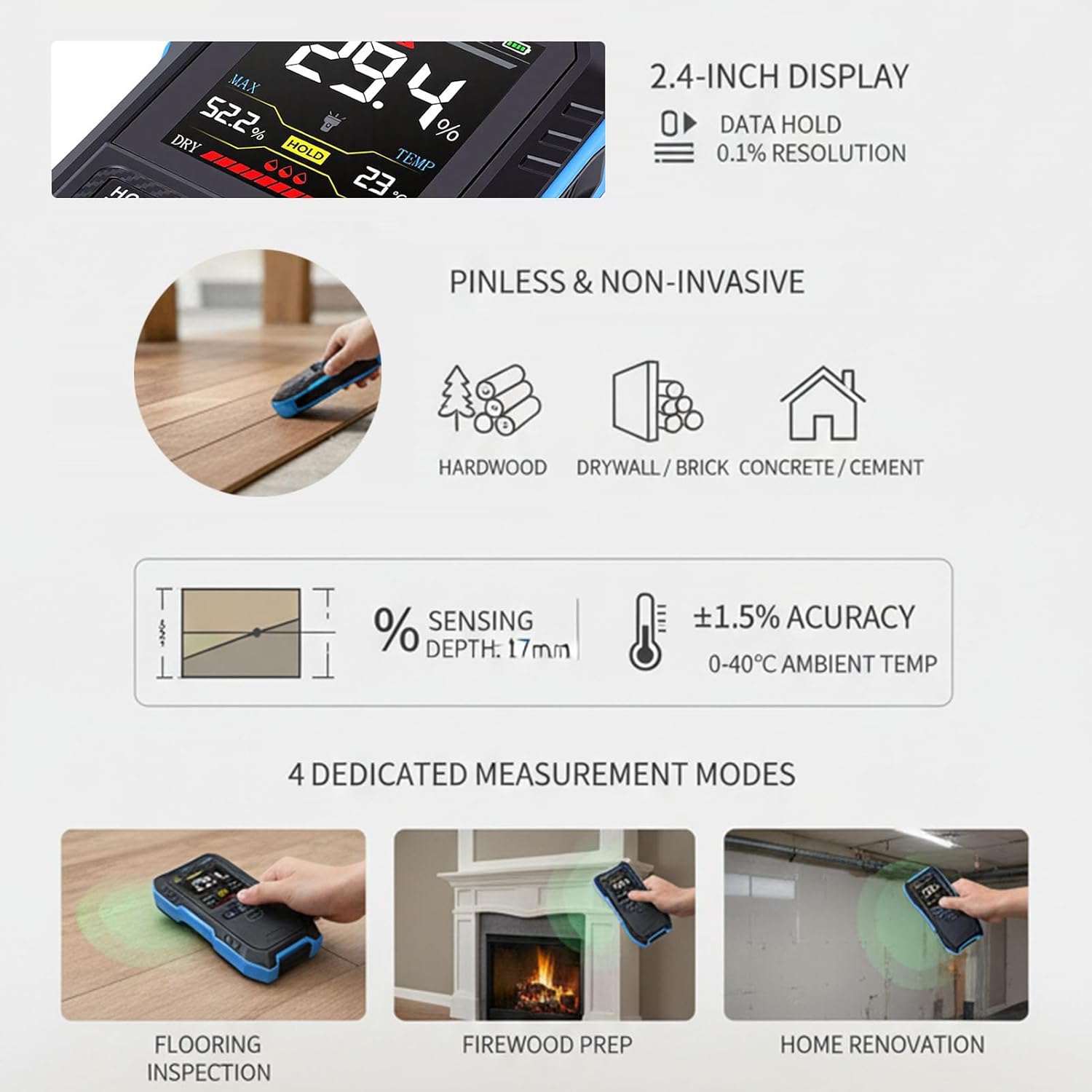 1. [Water Content Detection] This humidity meter features a 2.4 inch screen and measures water content in wood, firewood, paper, drywall, concrete, cement, gypsum, and bricks, making it suitable for construction projects 2. [4 Measurement Modes] This pinless humidity detector offers 4 dedicated measuring modes for hardwood, softwood, drywall, and brick, ensuring precise humidity testing across different materials 3. [Pinless and Rechargeable Design] The rechargeable humidity meter provides safe, non invasive measurements without damaging surfaces, and its built in battery ensures portability and convenience 4. [Data Hold and Record] Featuring data hold and record capabilities, this wood humidity tester allows users to store and re view measurements for convenient data management and analysis experience 5. [Wall and Wood Testing] This humidity meter is suitable for wood and wall detection, helping quickly detect humidity levels in building materials, aiding in home renovation and maintenance tasks Spec: Item Type: Wood Humidity Meter Product Material: ABS Battery Capacity: 1 x 1000mAh Li Battery (built in) Screen: 2.4 inch Display Resolution: 0.1% Maximum Sensing Depth: Approx. 17mm / 0.67in Measurement Range: 0-75.0% Accuracy: ±1.5% Ambient Temperature: 0-40℃ How to Use: Please follow the instructions in the manual. PackageList: 1 x Wood Humidity Meter 1 x User Manual 1 x Charging Cable