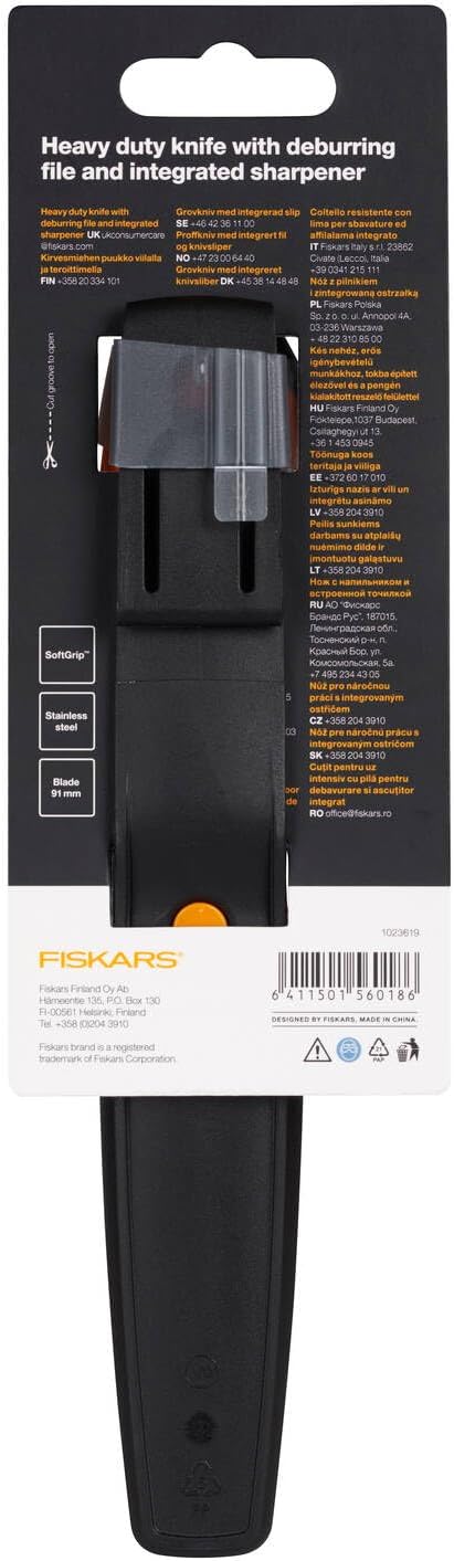 Robust knife with wider blade for harder jobs, Can also be used as a trimming file- High cutting power and durability thanks to the sharp blade made of high-Steel, Ergonomic 3-component handle for secure grip- Knife with integrated StaySharp knife sharpener, Can be carried, for right- and left-handed users- Exposed handle with hammer head for more functionality and comfort, Durable, Finnish Design- Contents: 1x Fiskars Heavy duty knife with sharpener, Total length: 21.9 cm, Blade Length: 9.1 cm, Weight: 150 g, Material: Stainless Steel/Plastic, Colour: Black/Orange/Green, 1023619