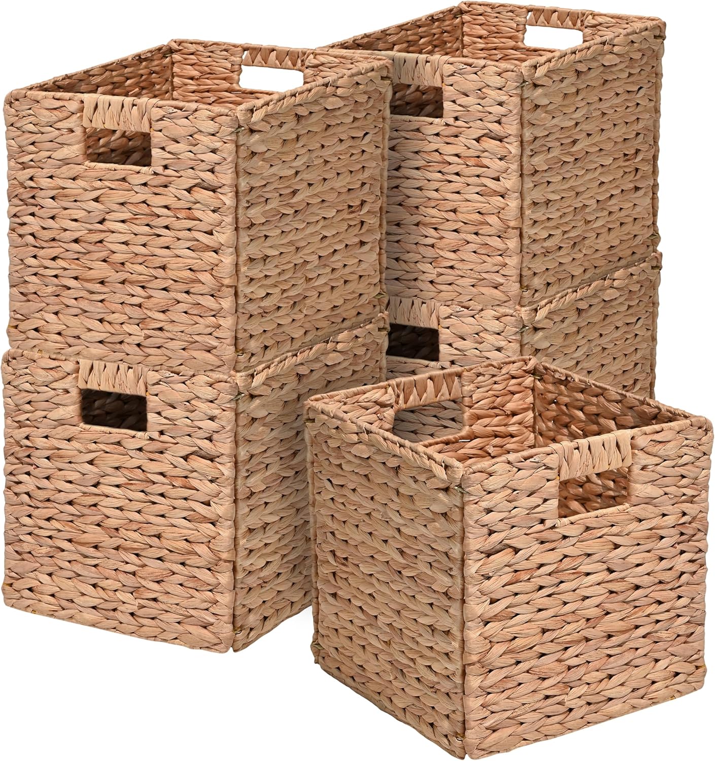Organize your living room, bedroom, office or nursery in classic farmhouse style with our set of five cube baskets. They're hand-woven from natural hyacinth fibers on a sturdy metal frame. Perfect for bookshelves or storage cubes, these versatile baskets can hold toys and books, organize clothing or gather craft supplies.