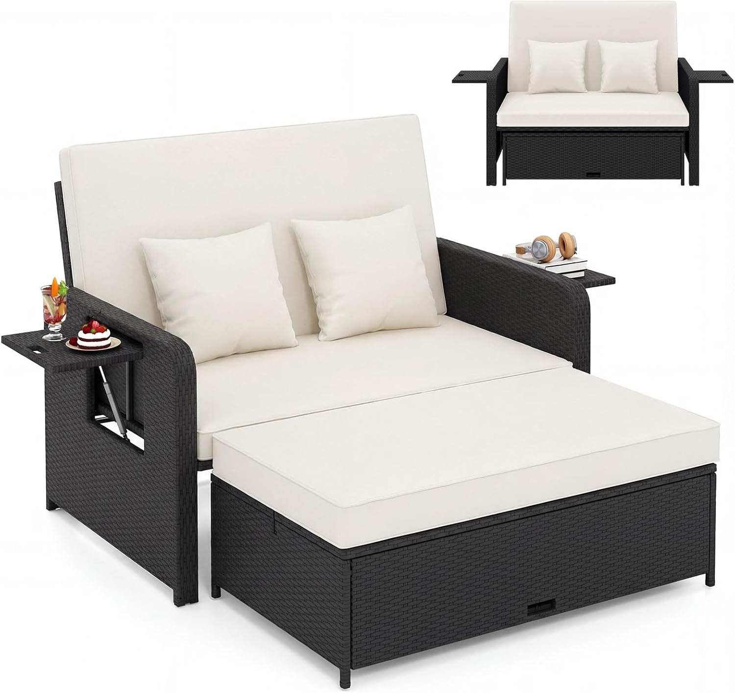 Description:Enjoy sunbathing, reading, or napping on this patio rattan daybed set with a 4-level backrest to cater to your every need. The plush cushions and throw pillows ensure a cozy sitting or lounging session. Convert this outdoor chaise lounger into a loveseat and coffee table set by utilizing the hidden storage in the ottoman. Keep your summer essentials close by with the retractable side trays. Made with fade-resistant PE wicker and a sturdy metal frame, this patio furniture set is built to withstand the outdoor elements.Features:Ottoman doubles as a coffee table for added storageHidden storage space in ottoman for convenienceSpace-saving design when tucking ottoman under loveseat4-level adjustable backrest to meet your needsRetractable side trays for easy access to necessitiesLabor-saving pneumatic rods for added convenienceSoft cushions and throw pillows for maximum comfortEasily removable cushion covers for effortless cleaningFade-resistant PE rattan for long-lasting durabilityPlease maintain cushions dry to prolong lifespanSpecifications:PE Rattan Color: Mix Brown/Mix Grey/BlackMaterials: PE Rattan, Metal, Polyester, SpongeLoveseat: 31”/40”/45.5”/47.5” x 67” x 36”/32”/25”/14” (L x W x H)Ottoman: 43.5” x 24” x 12.5” (L x W x H)Seat Cushion: 43.5” x 24” x 3.2” (L x W x Thickness)Back Cushion: 43.5” x 24” x 6” (L x W x Thickness)Ottoman Cushion: 43.5” x 22” x 4.5” (L x W x Thickness)Throw Pillow: 16” x 16” x 6” (L x W x Thickness)Loveseat Seat Height: 14”Total Net Weight: 68.5 lbsLoveseat Weight Capacity: 800 lbsOttoman Weight Capacity: 800 lbsPackage Includes:1 x Loveseat1 x Ottoman1 x Seat Cushion1 x Back Cushion1 x Ottoman Cushion2 x Throw Pillows1 x Instruction Guide