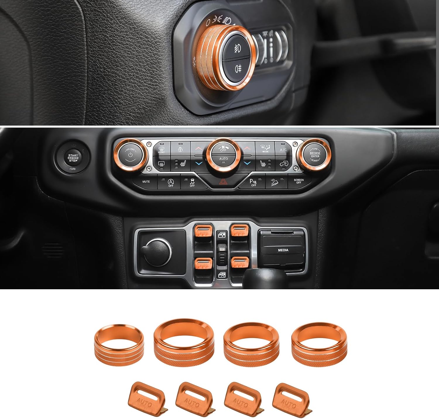 Fitment: Compatible with Jeep Wrangler JL JLU 2018 2019 2020 2021 2022 2023 2024 & Gladiator 2020 2021 2022 2023 2024 JT with specific dial panel. Features: - 100% Brand New - Color: Green - Material: Aluminum Alloy - Easy Installation - Interior Upgrade - Durable & Rust-Proof Special Mold Design. The button cover uses a specific mold to ensure a perfect fit for Wrangler 2018-2024 JL JLU & Gladiator 2020-2024 JT. High-Quality Material. Made of Aluminum Alloy that is rust-proof and durable. Easy Installation. -Button covers simply press the cover into the switch knob. -Window control button covers are easily installed using double-sided tape. Clean the surface and heat the tape before installation will help the cover stick in place better. Attention: The JL and JT have 3 different kinds of AC control knobs (see #2 product picture). Please compare your AC knobs with our picture before you purchase. Package Included: - 3 x JL AC switch knob covers - 1 x Headlight knob cover - 4 x Window switch button cover