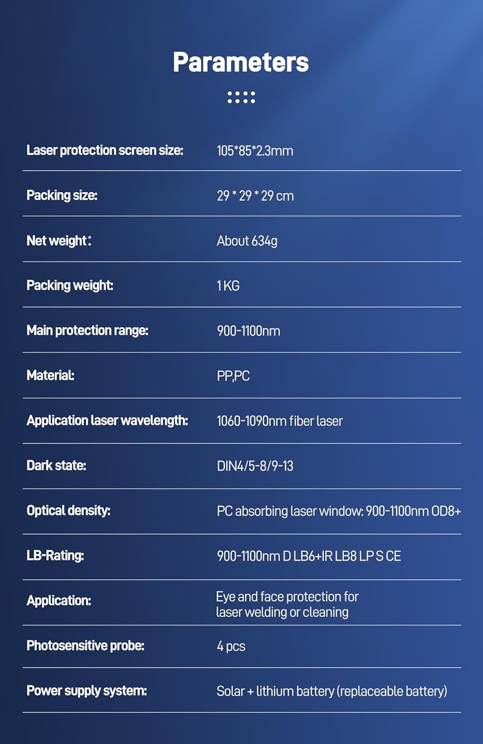 | Included Components | Laser Protection Helmet 1PC |
