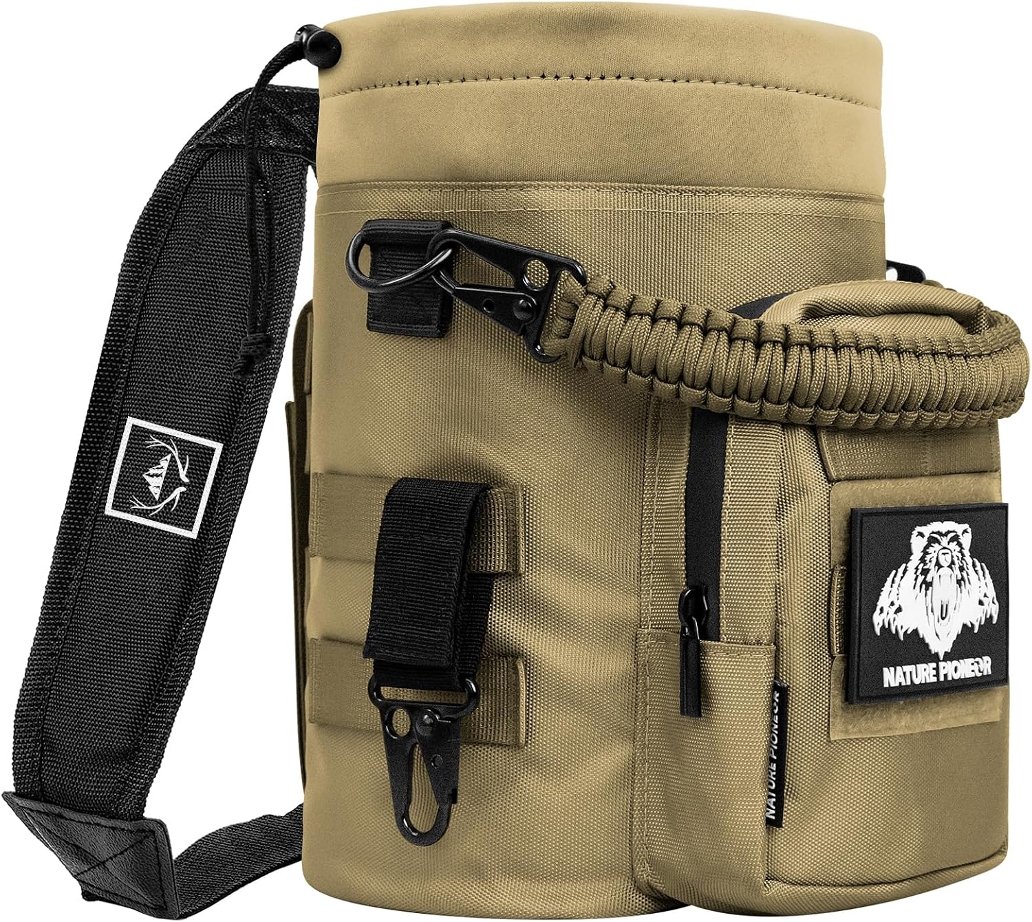 Size: Water bottle bag: 32oz: 3.74"(W)x9.45"(H) 64oz: 5.2"(W)x8.66"(H) Material: 1200D nylon material. Colour: Black, Forest, Khaki, Deep Sea Shoulder strap Size: 60.83x2.3 inches Material: Nylon material Features: Design of leaking holes at the bottom The hook can be combined with other items such as belts, outdoor bags, etc. Wide application: This tactical water bottle bag is very suitable for hunting, hiking, camping, fishing or field trips. Good outdoor carrying case. This unique design provides a comfortable fit feeling. This is a great feature to have when walking or jogging. the size is measured manually, and the measurement has 0.4-1in error, which is a normal phenomenon.
