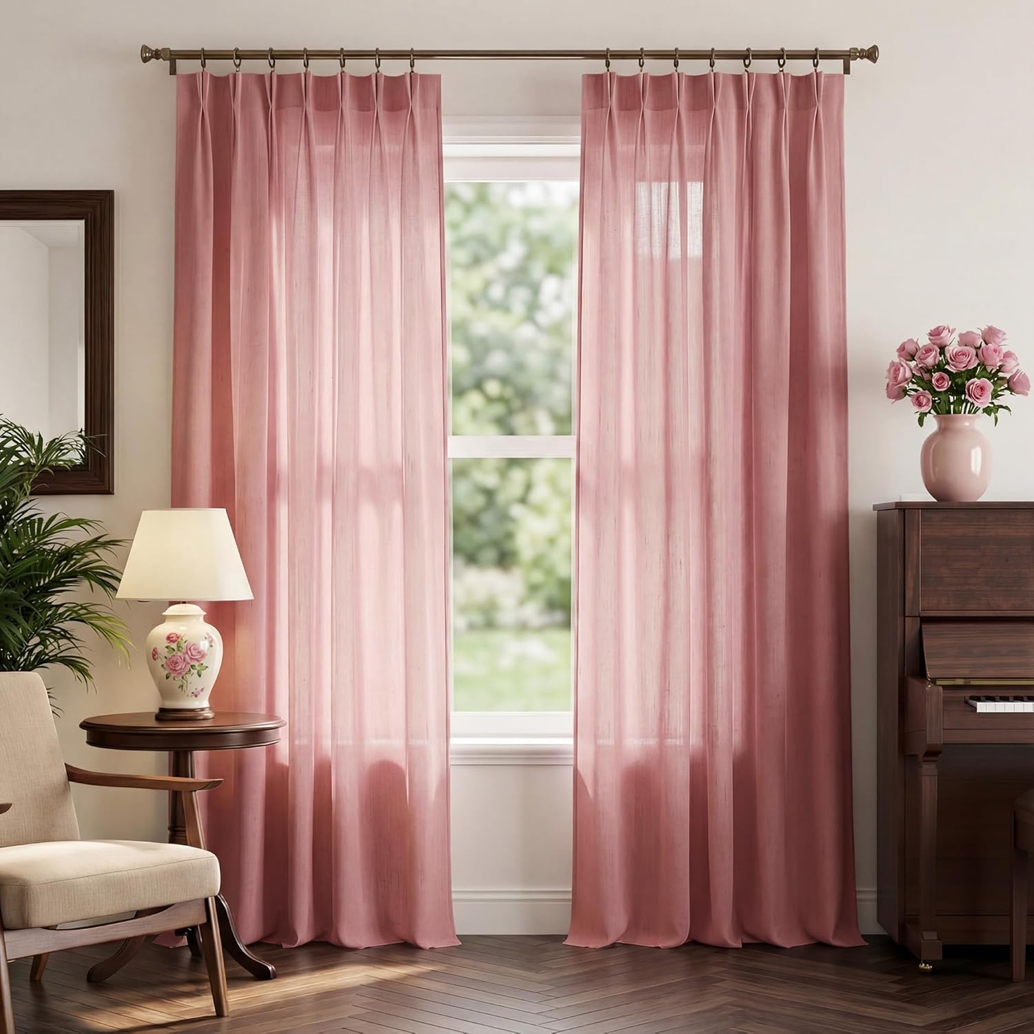 This set of 2-panel linen curtains, featuring 7 neat pleats on each panel, is designed to blend practicality with emotional comfort for every home. Boasting versatile hanging options (compatible with both hooks and Roman rods), it lets you effortlessly switch styles to match your mood; its premium linen fabric gently filters harsh sunlight into a warm, diffused glow while ensuring reliable privacy, creating a calm and secure sanctuary in your living space. What’s more, the fresh, understated linen texture with classic color hue adds sophisticated depth to your decor, seamlessly fitting Nordic, minimalist, rustic, coastal and other styles to elevate your home’s aesthetic instantly. With sturdy pleats that keep the curtains hanging evenly and in place, it offers hands-free convenience—no more tedious adjustments, just pure ease to enjoy the little joys of daily life at home.