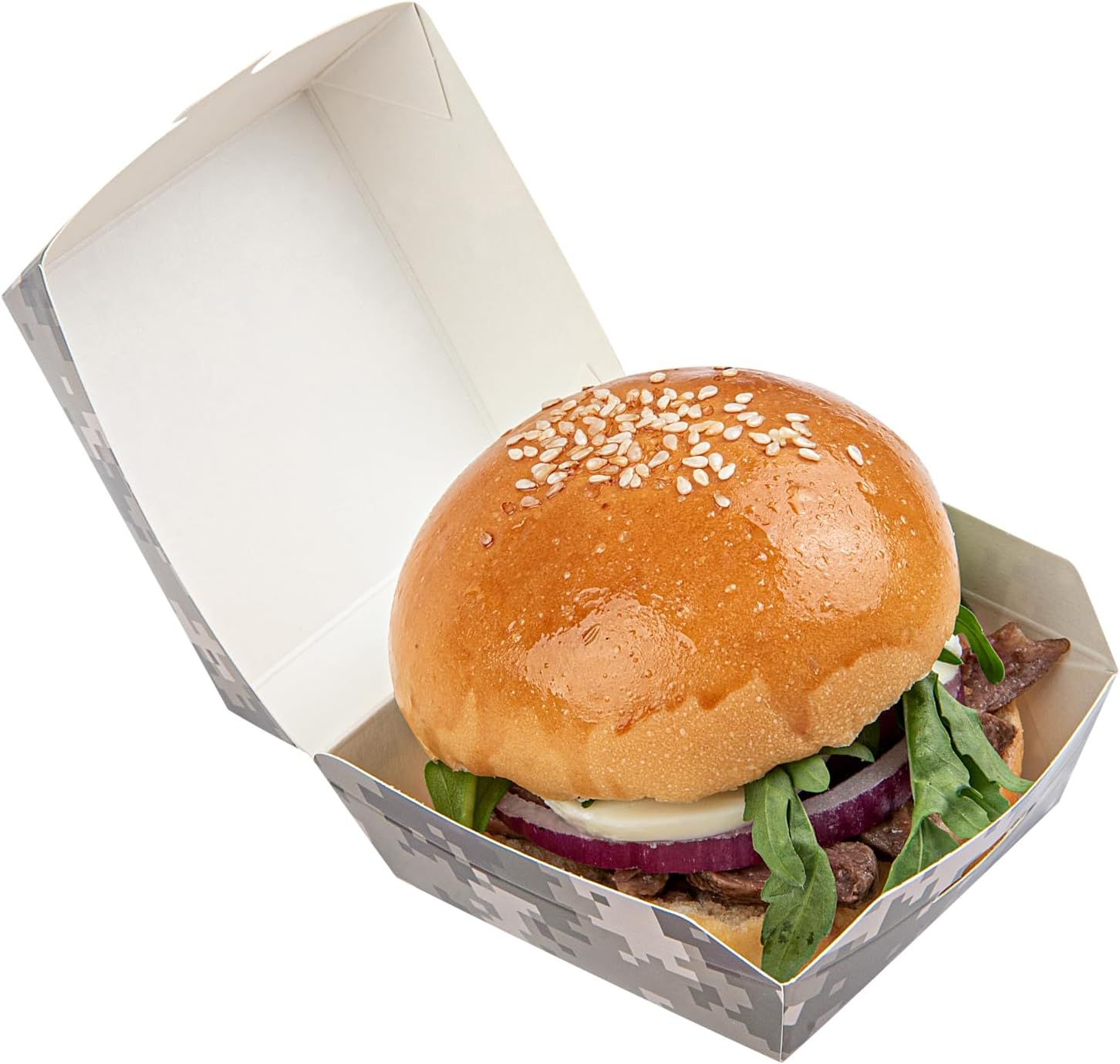 Elevate your catering services with our Camouflage Paper Mini Burger Boxes. Built from premium paper, these slider packaging boxes provide sturdy and reliable storage for packing a variety of hot or cold food. These burger boxes have built-in tab lock closures to keep your sliders and appetizers intact during transit. The stylish camouflage print of these take out boxes enhances your food presentation, blending well with various event settings. These paper slider containers are disposable, allowing for easy cleanup. Each clamshell food container measures 2.8 inches in length by 2.8 inches in width by 2 inches in height, making it a great fit for miniature snacks. Sold in a 100 count box.