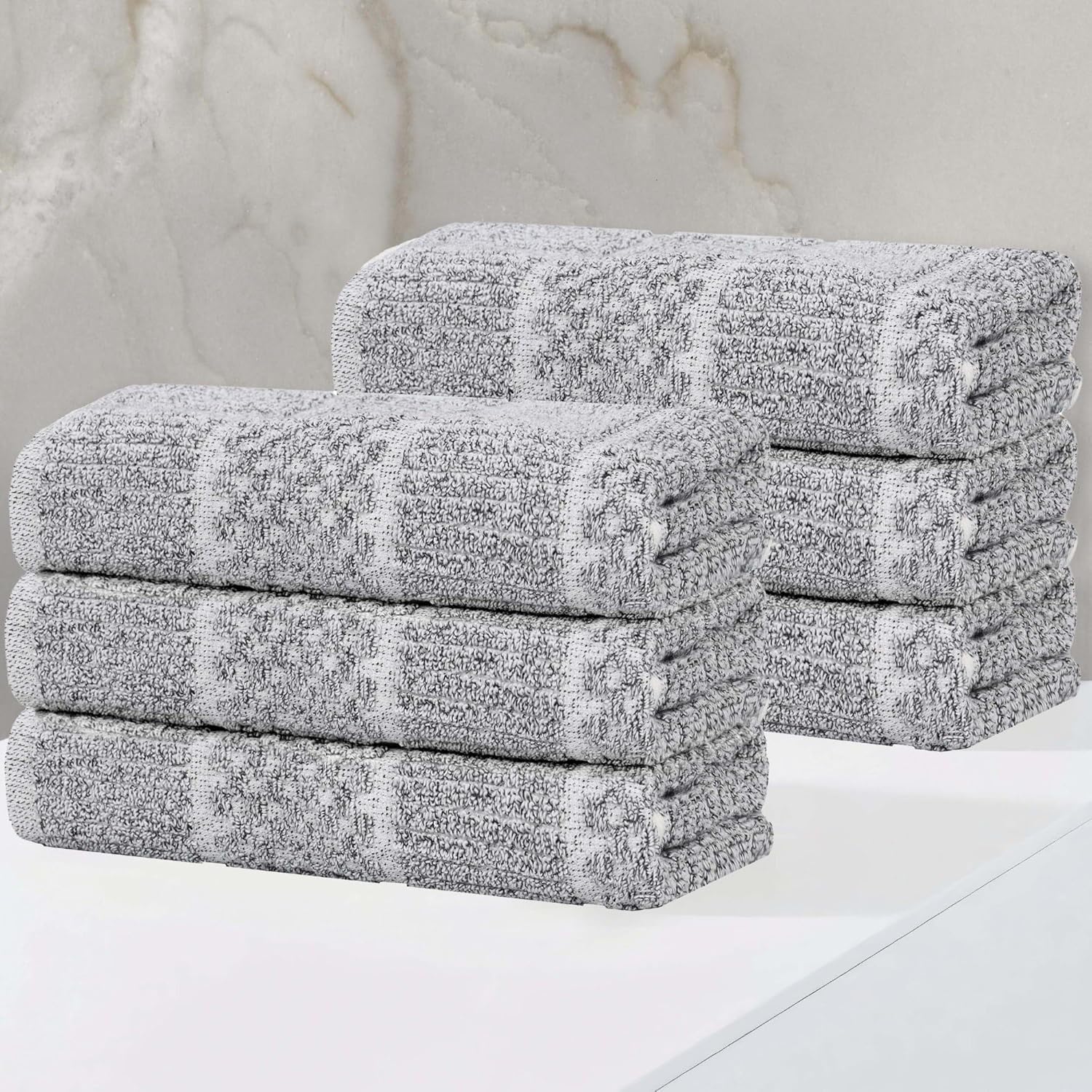 Versatile and chic, indulge in the Superior Naples Cotton Blend 6 Piece Towel Set. Crafted from an 80% cotton and 20% viscose blend, these towels showcase an alternating checkered and ribbed design that creates a unique and eye-catching look. This bundle artfully blends chic aesthetics with exceptional absorbency, ensuring a soft and gentle touch against your skin. The medium weight design is durable, moisture wicking, and quick drying, while the diverse palette of elegant colors allows you to personalize your bathroom’s aesthetic effortlessly.