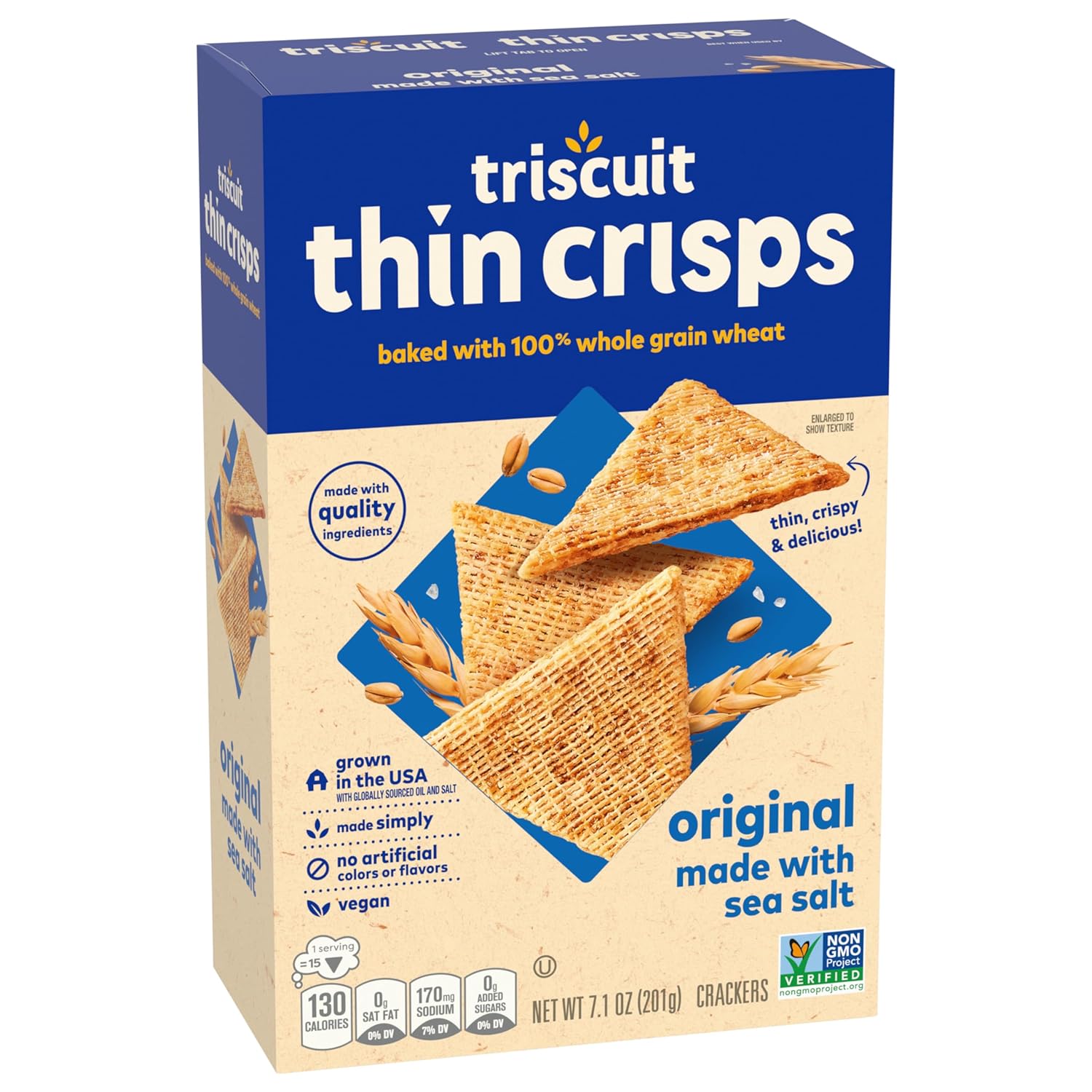 Triscuit Thin Crisps Original Whole Grain Wheat Crackers are made simply with quality ingredients. Baked to perfection, these vegan snack crackers use 100% whole grain wheat proudly grown in the USA, oil, and sea salt for a classic flavor. The triangle shaped snack crackers are made with their signature woven texture for a satisfying crunch. Triscuit crackers are vegan, Non-GMO Project Verified, made without artificial colors or flavors and a good source of dietary fiber (see Nutrition information for fat content) for delicious, wholesome goodness. Enjoy the crunch of these delicious crackers on their own, or top them with your favorite cheese, fruit, or flavorful spreads. Triscuit Thin Crisp cracker snacks cover all your snacking needs, whether you need lunch snacks for kids, vegan snacks for adults or on the go snacks for traveling. Serve them at parties on your meat and cheese tray as fun, easy appetizers. Create a delicious vegan food charcuterie board featuring Triscuit original vegan crackers alongside your favorite vegan cheese, vegan meat, dips, fruit and vegetables.