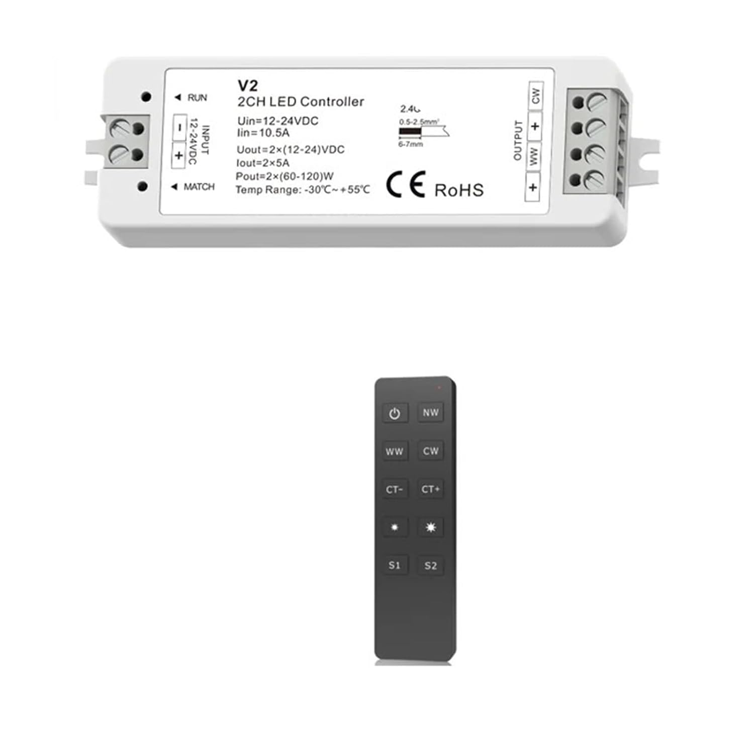 Outlet & Switch CombosTechnical parametersOutput power: 2x(60-120)WOutput voltage: 2x(12-24)VDCOutput current: 2CH, 5A/CHInput and outputInput voltage: 12-24VDCInput current: 10.5ACertificationCE, EMC, LVD, redOutput typeconstant voltageBi-color LED controller=========Features: CCT LED DimmerModel: V2Oscillation frequency: 2KHz (default)Connection method: LED dimmer with controlCertification: CCC, CE, EMC, FCC, ROHSVoltage: 12-24VMaterial: ABSPower: 2x(60-120)WPower supply: DCmaximum. Load power: 240WRemote control distance: 30MApplicable lights: CCT single color LED light stripControl mode: LED dimmer switch CCTOrigin: Mainland ChinaProduct Type: RGB ControllerType: LED dimmer