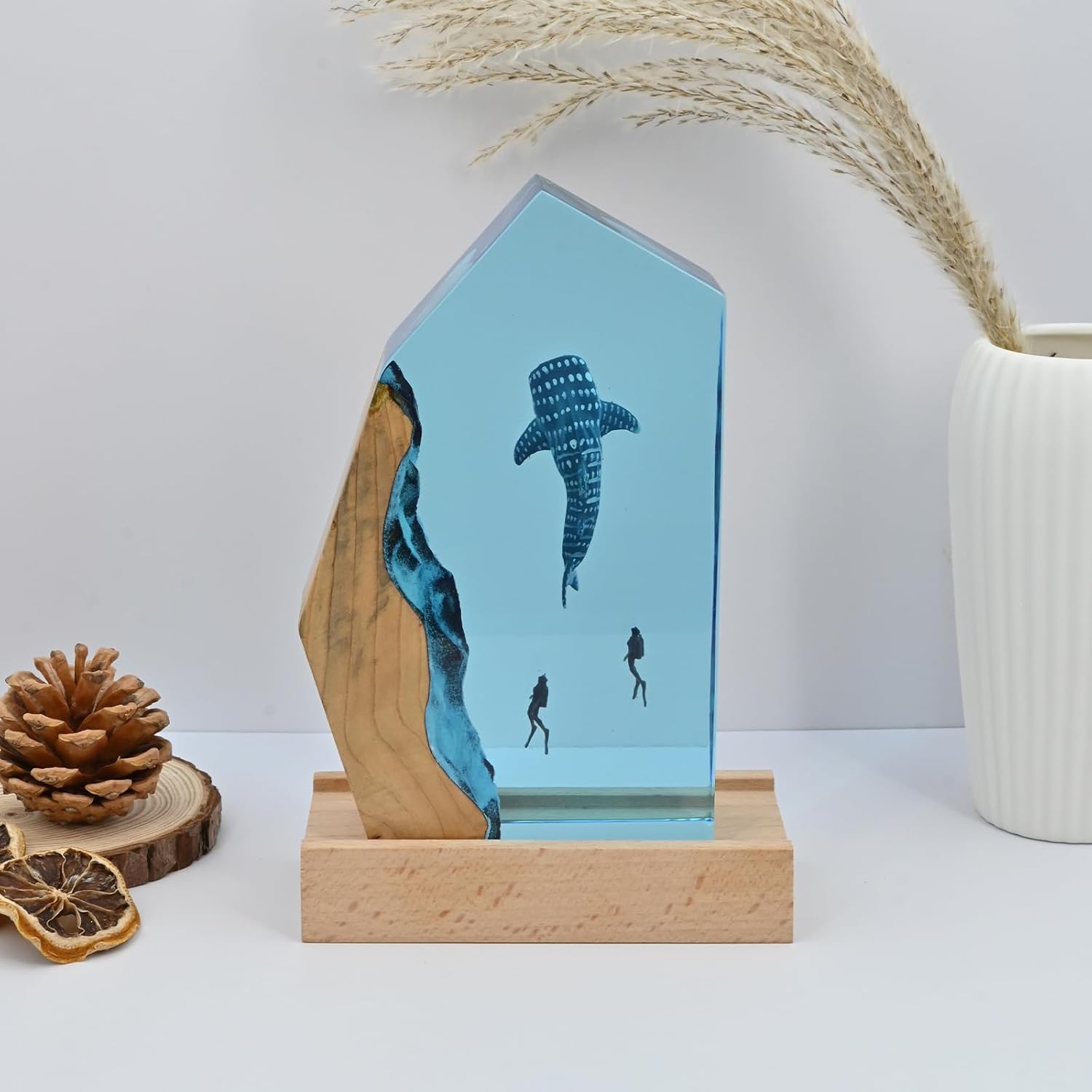 This ocean-themed resin night light will take you into a mysterious and fascinating underwater world. In the night light, you will see two whale sharks swimming in the water.The whole scene is made of finely crafted transparent resin. The light shines through the resin, emitting a soft glow, illuminating everything in the underwater world.This ocean-themed resin night light is equipped with a wooden base, which integrates natural elements to create an original and warm atmosphere. Whether placed in the bedroom, living room or office, it can create a charming ocean atmosphere, allowing you to feel tranquility and beauty in your busy life.Size: 5.91*4.33*1.57 inchesPacking box:Resin ornaments x 1Wooden base (with USB cable) x 1Wipe cloth x 1 (In order to better protect the product during transportation, all resin ornaments will have a layer of oil on the surface. When you receive the package, you can use the wipe cloth we gave you to wipe it clean.)